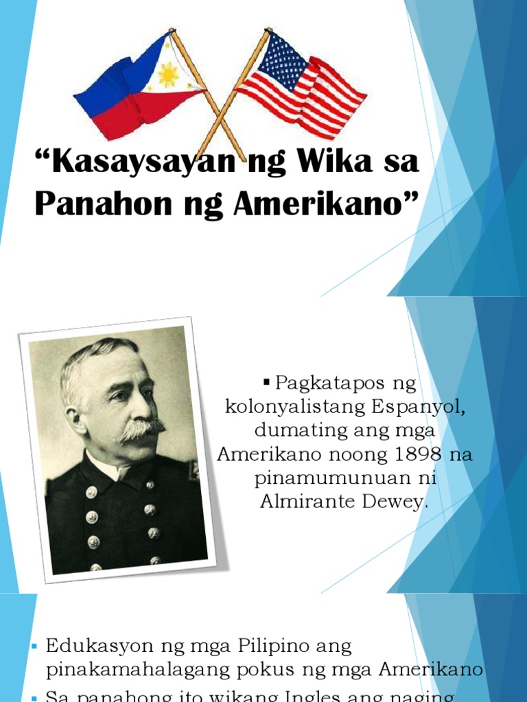 Panahon ng Kasarinlan Hanggang sa Kasalukuyan Dumating ang mga Amerikano sa Pilipinas noong taong 1898 sa pamumuno si George Dewey Mayo 1 1898 Kasunduan sa Paris Disyembre 10 1898 Upang tuluyang masakop. Kalagayan ng wikang filipino noong panahon ng amerikano. Wikang Filipino Sa Panahon ng mga Amerikano at Hapones.