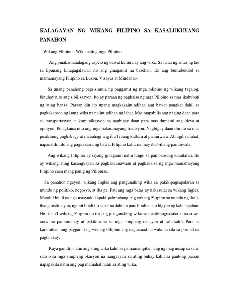 Mula sa ating tinalakay ngayong araw ay isa sa mga tumatak saakin ay kung walang filipino hindi natin. AB Filipino ABFil 2 Bachelor of Science in Social Work 3454 Accountancy AC2101 Purposive Communication GEED 10063 Speech S001 Law on Obligations and Contracts LAW 101. 20112016 Hindi maiiwasan ang pagbabago sa ating kultura ngunit bilang isang dalaga na naninirahan sa makabagong panahon ang pag-unlad ng wikang Filipino ay parehong nakatutulong at nakasisira sa mga kaugalian ng ating bansa.